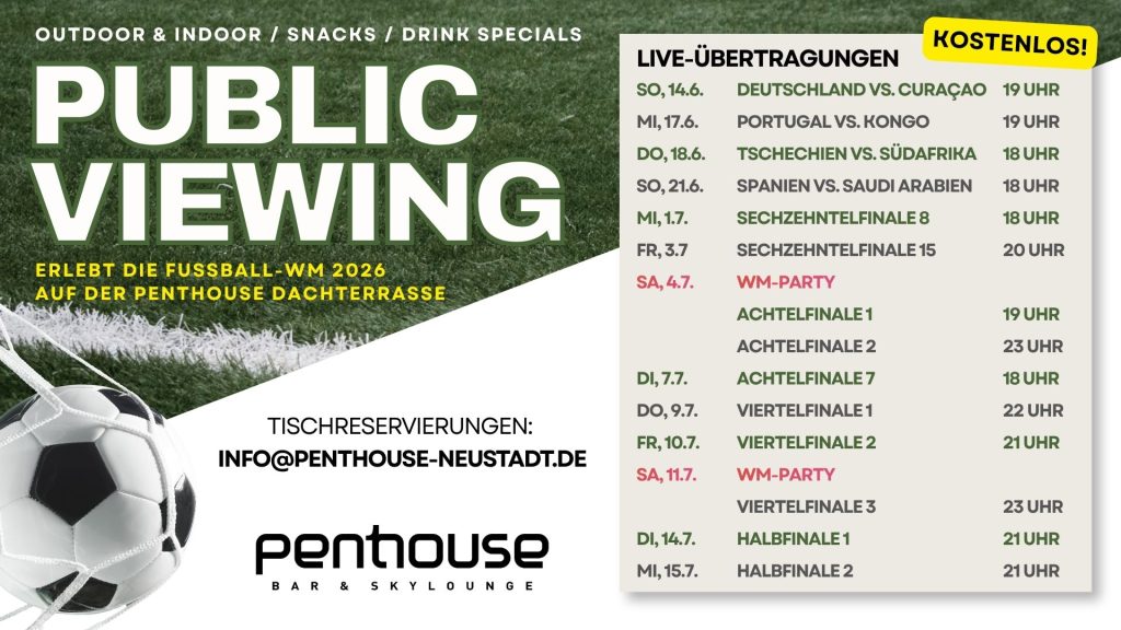 Das Penthouse Neustadt ist eure Cocktail-Bar und Event-Location im Zentrum von Neustadt am Rübenberge! Wir servieren euch die besten Drinks der Stadt und organisieren regelmäßig Veranstaltungen und Partys. Reserviert ganz einfach online einen Tisch für die Bar oder sichert euch eure Tickets für eines unserer nächsten Events.